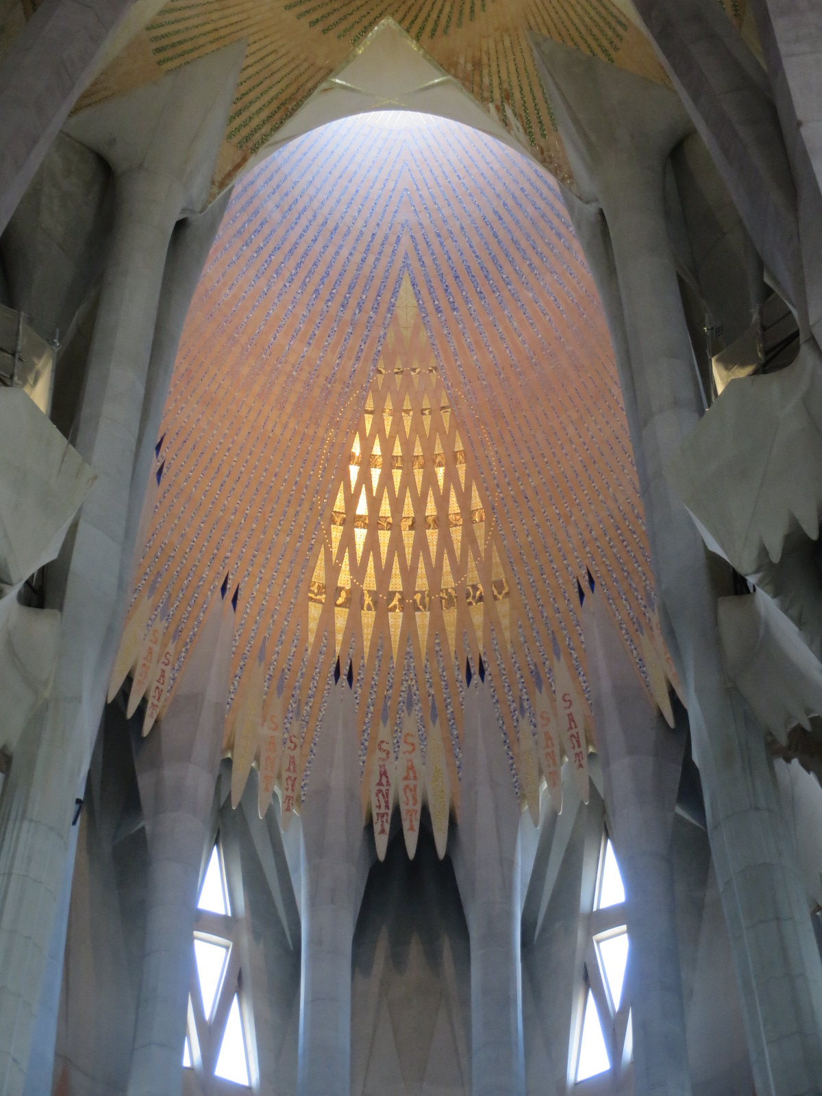 Stephanie & I met for a 9:30 appointment and they let us in early…The place was already jammed but nothing like it would be once we left. We meandered around listening to the audio tour and trying to navigate the numbers…The Sagrada was started in 1882 and was still in progress in 1926, the year Gaudi died from being hit by a street car. He is buried in the Crypt and Pope Benedict consecrated the church as a Basilica in 2010. It certainly is unique in it’s architecture…Neo Gothic…What I love is how he uses light. He uses his Stain Glass windows, designed by Joan Vila-Grau and sky lights as focal points to reflect lights in particular ways for each time of day.